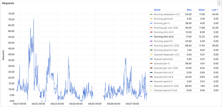 Last month's statistics illustrate the contrast between typical and most demanding usage strikingly—the median prompt length for Kimi K2.6 is around 2,200 tokens, while the 95th percentile reaches nearly 100,000 tokens per single request.