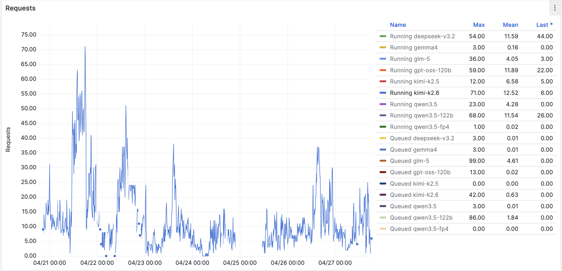 Statistiky z posledního měsíce ukazují kontrast mezi typickým a nejnáročnějším použitím výmluvně — medián délky promptu se u Kimi K2.6 pohybuje kolem 2 200 tokenů, zatímco 95. percentil dosahuje téměř 100 000 tokenů na jeden požadavek.