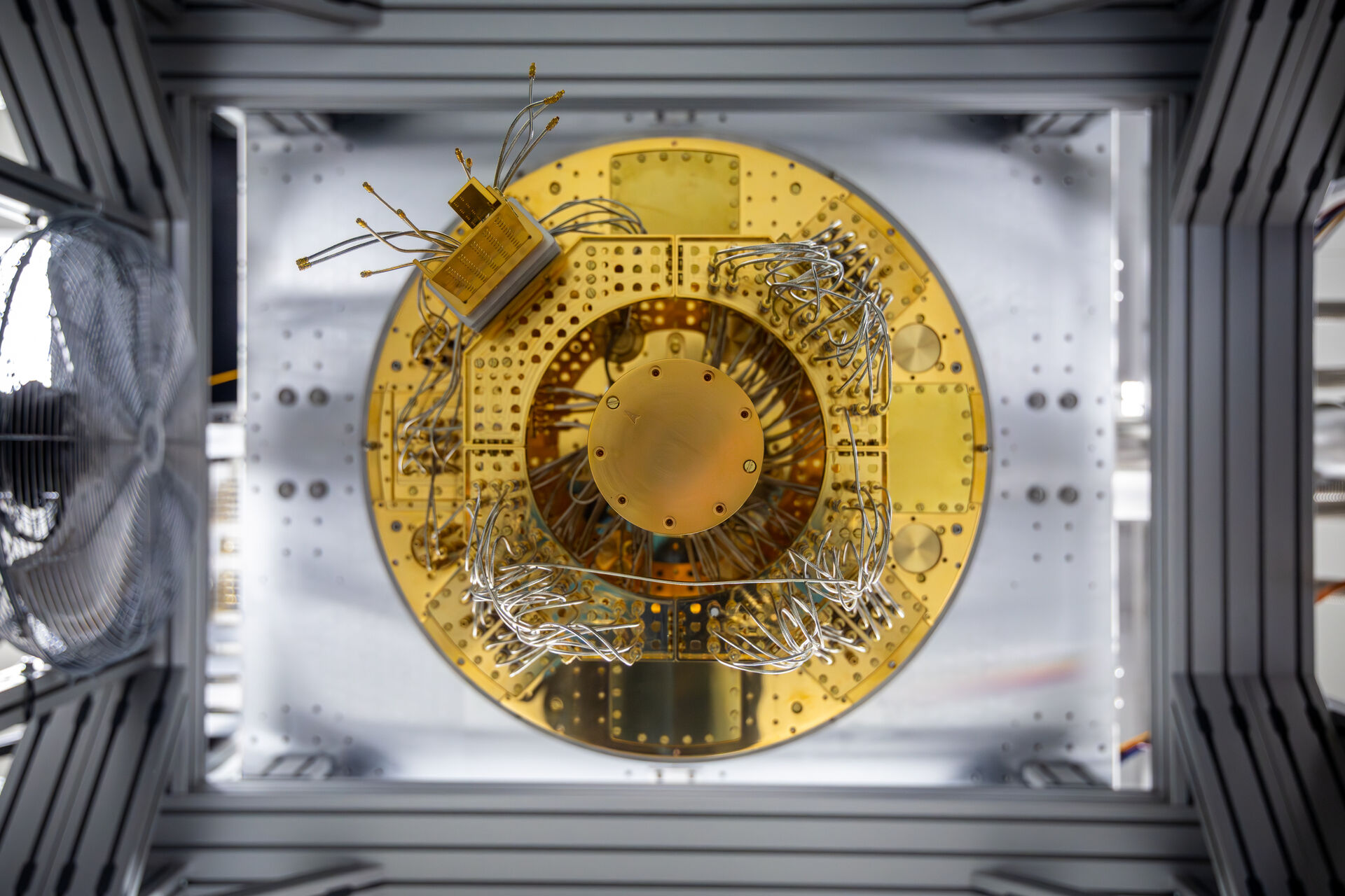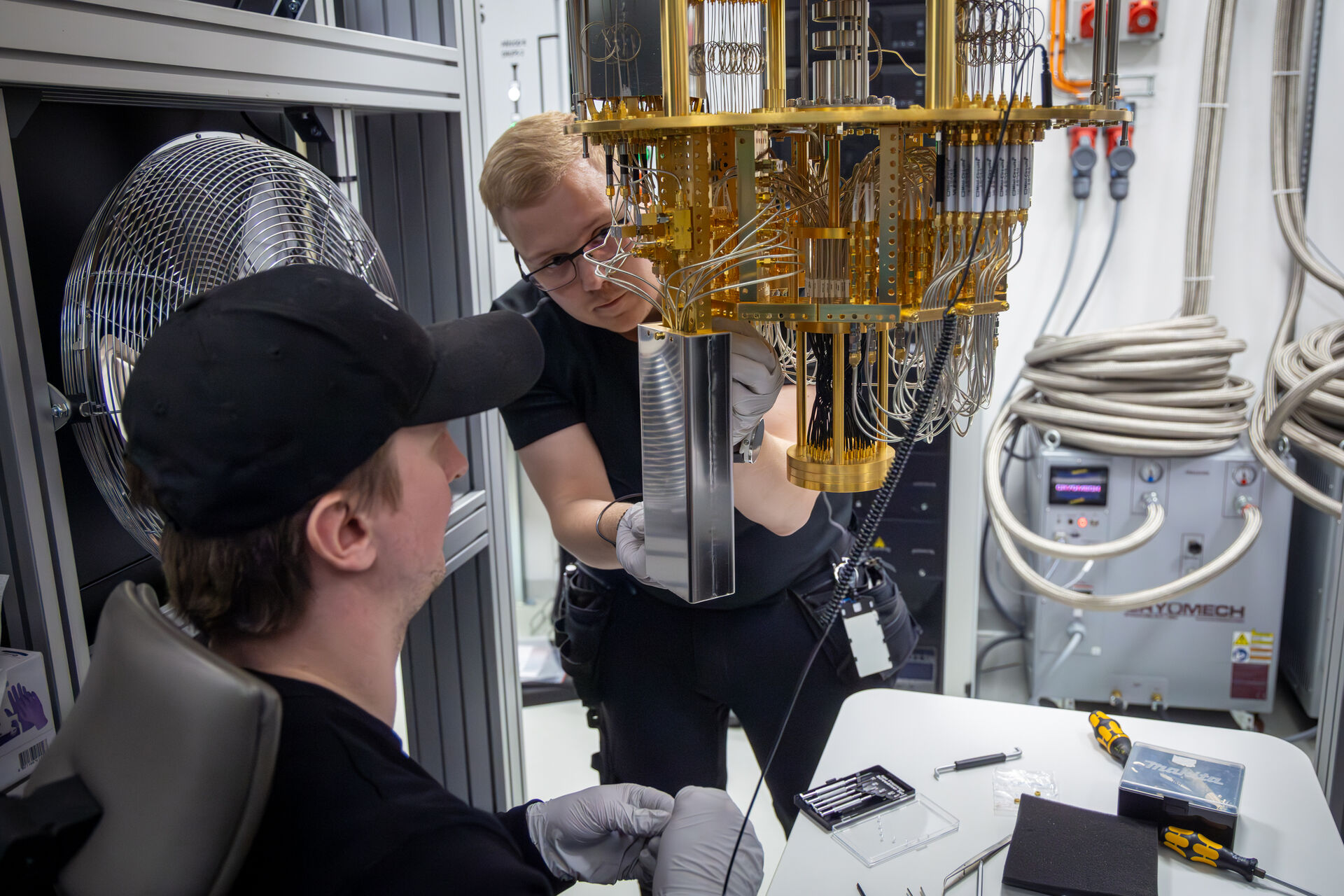 Aby mohl VLQ fungovat, musí být jeho qubity udržovány v extrémně nízké teplotě — pouhých 0,01 Kelvinu nad absolutní nulou (asi –273,14 °C), tedy chladněji než ve vesmíru. Tento „mrazivý“ stav zajišťuje speciální kryostat, jehož část připomíná lesklý zlatý lustr o několika patrech a vážící přibližně 300 kg. Takové chlazení je nezbytné, protože i nepatrné zahřátí by mohlo zničit křehké kvantové stavy qubitů. Samotný čip je umístěn ve spodní části kryostatu a pro dosažení takto extrémně nízké provozní teploty se využívá kvantových efektů, ke kterým dochází při smíchávání izotopů helia.